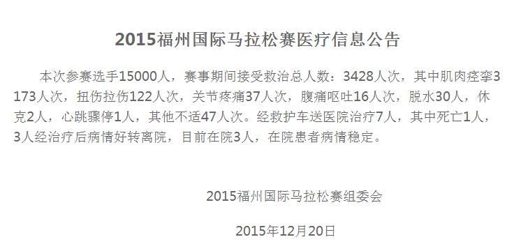 遺憾的是,首屆福州國際馬拉松賽發(fā)生了一起悲劇,20日上午8點(diǎn)40分,參賽者盧某在離開半程馬拉松起點(diǎn)10.5公里處突然倒地,搶救無效死亡。此外,福馬組委會還發(fā)布賽事醫(yī)療信息公告。